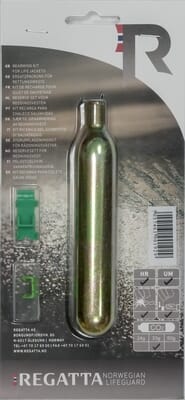 Standard CO2 sylinder på enten 24 gram eller 33 gram som passer til utløsermekanisme for de fleste oppblåsbare redningsvester. 24 gram passer til juniorvester som Regatta Childsafe / Aquasafe junior, mens 33 gram passer til oppblåsbare redningsvester for voksne som Regatta Aquasafe / Northsafe / Seasafe / Freesafe / Sportsafe.