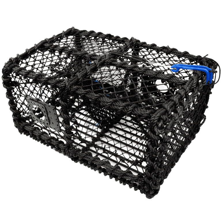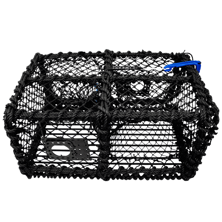 Krabbe- og hummerteine med flat topp. Den flate toppen gjør det praktisk å stable teinen i båt/nøst. Tillaget med råtnetråd. Med tausurring/beskyttelsestau. Agnpose med lukking i toppen. Åpning i enden. 2 fluktåpninger, 60/80mm. Enkle å stable, fisker godt og er plasseffektive.