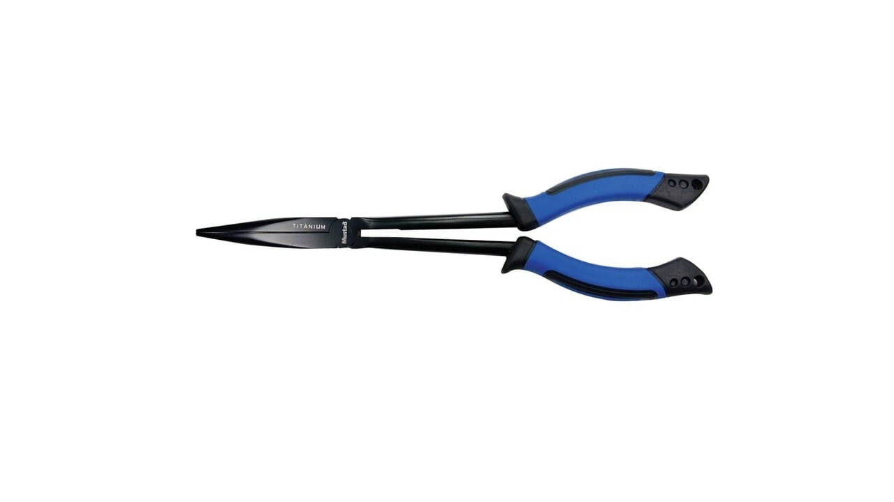 Mustad long nose pliers er laget av rustfritt stål med et svart titannitridbelegg. Denne tangen har også myke svarte og blå grep, som gir et komfortabelt, men fast grep. De ekstra lange kjevene lar sportsfiskere holde hendene klare og unna skarpe fisketenner og skarpe gjenstander.