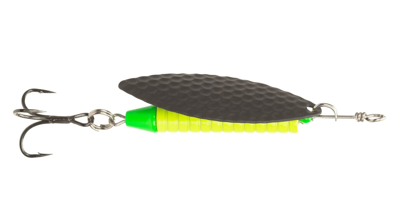 Laksespinnere blir stadig mer populære noe som vårt store utvalg gjenspeiler. Farge inspirasjonen er hentet fra våre mest solgte Prey Target Salmon wobblere og delvis overført til disse spinnerne. Nesten alle butt fargene har innslag av UV (Ultra violett). UV fanges ikke opp av menneskeøyet, men synes godt for fettfinne-fisker som røye, ørret, sjøørret og laks! Dette kan være det lille ekstra som skal til for at fisken hugger! Lys på disse med en UV–lampe og du vil se en glød som gjør det vanskelig å la være å gi disse et forsøk! Alle komponenter er montert på en ekstra tykk wire, krok PH56 -2x strong med nålespiss og splittring i meget god kvalitet.